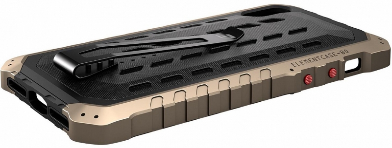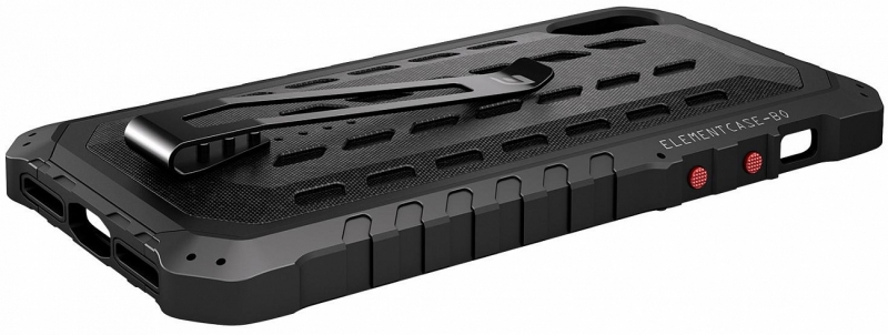 Element Case Black OPS обладает необычным внешним видом и прочной, продуманной конструкцией, элементы которой соединяются специальными болтами. Задняя накладка выполнена из термополиуретана, а боковые накладки из алюминия. Нижняя часть чехла выполнена из поликарбоната и имеет заглушку для разъема зарядки. Для удобства ношения на задней панели имеется клипса для крепления на ремень или карман.
